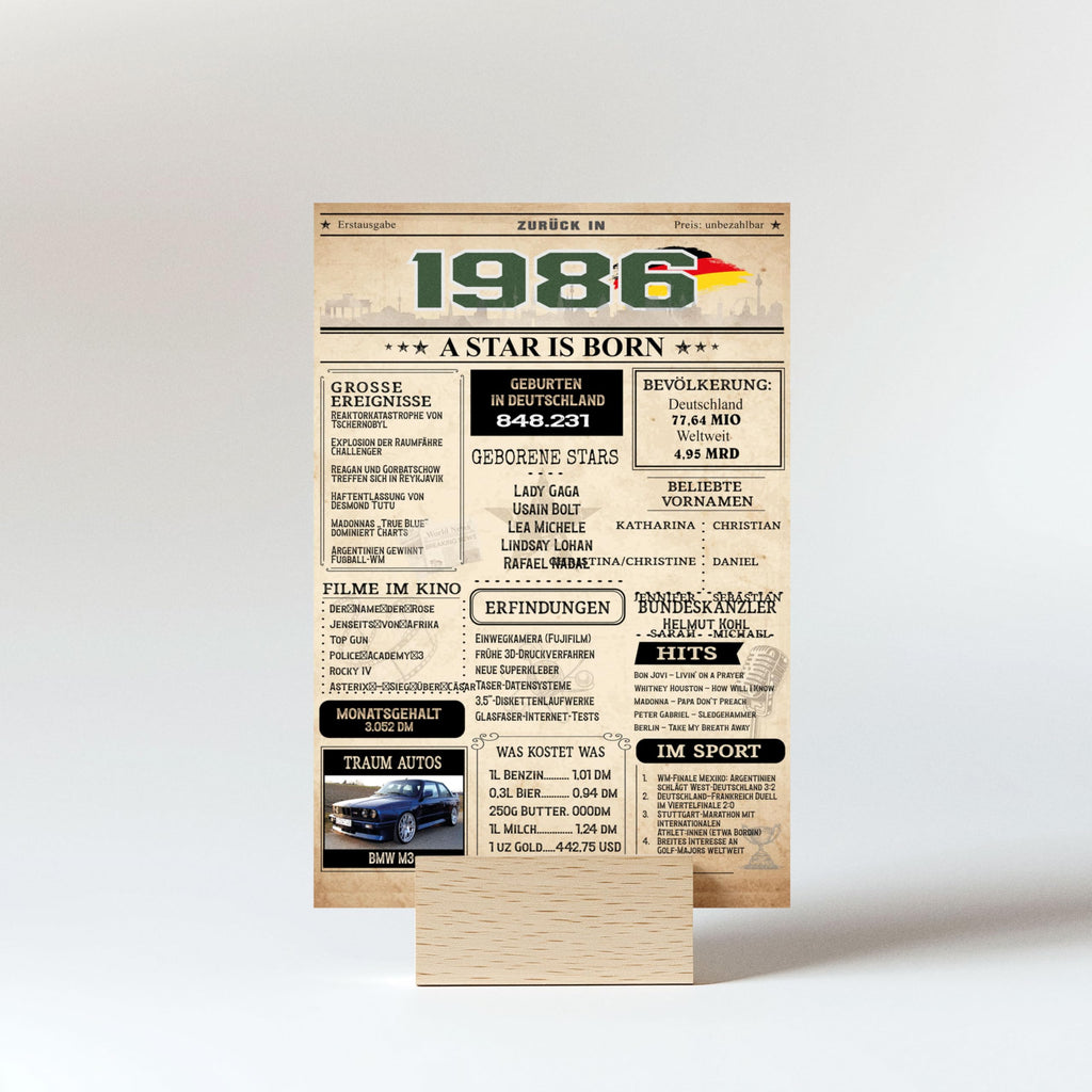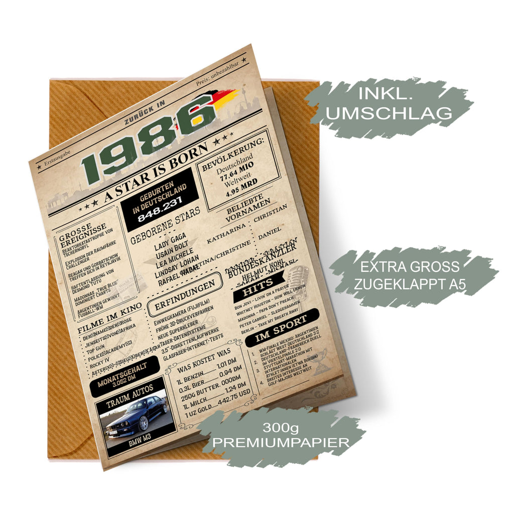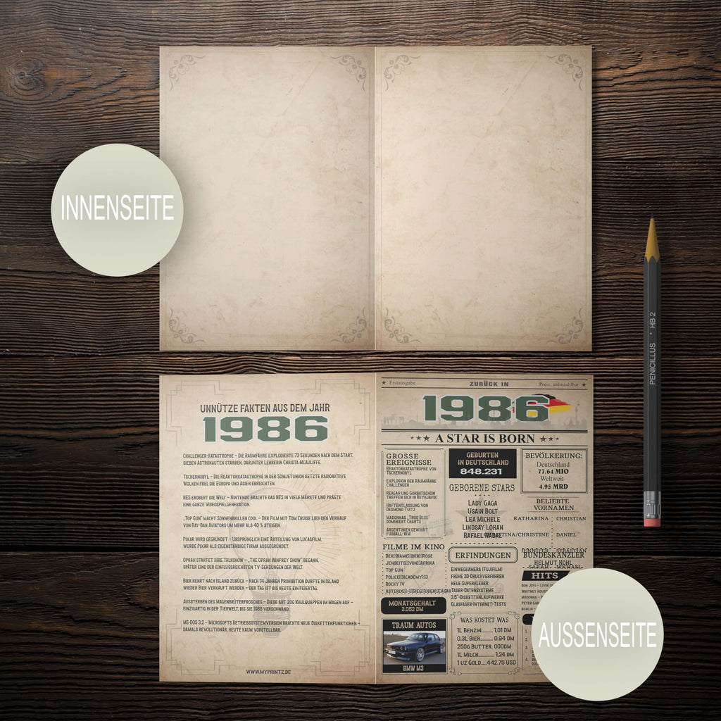 Diese Karte sorgt für Gesprächsstoff! Während die Vorderseite im authentischen Retro-Zeitungsstil die großen Ereignisse feiert, bietet die Rückseite eine kuriose Sammlung an unnützem Wissen und amüsanten Fakten aus dem Jahr 1986. Ein garantierter Eisbrecher für jede Geburtstagsfeier!