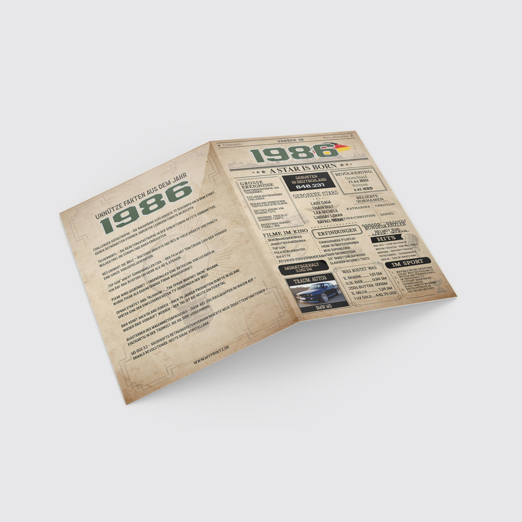 Zeitreise zum 40. Geburtstag: Premium-Jahrgangskarte 1986 im Zeitungs-Design